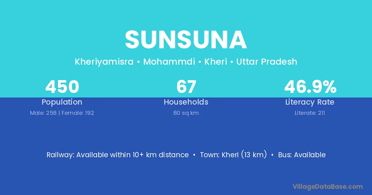 The literacy rate of Sunsuna village is 43.18%. Male literacy stands at 53.49% and female literacy at 33.33%.