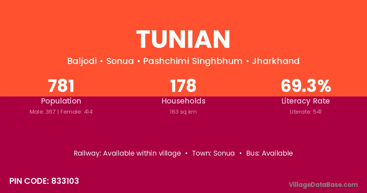 Tunian village is located in the Sonua Subdivision of the Pashchimi Singhbhum district in Jharkhand .