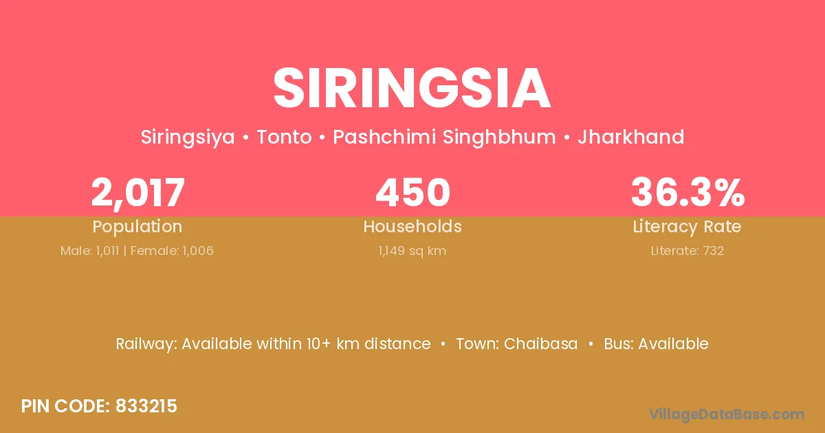 According to Census 2011 information, the village code of Siringsia village is 833215.