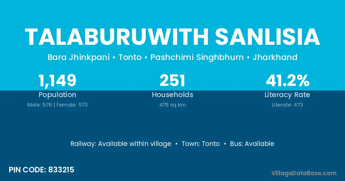 The literacy rate of Talaburuwith Sanlisia village is 41.17%. Male literacy stands at 48.61% and female literacy at 33.68%.