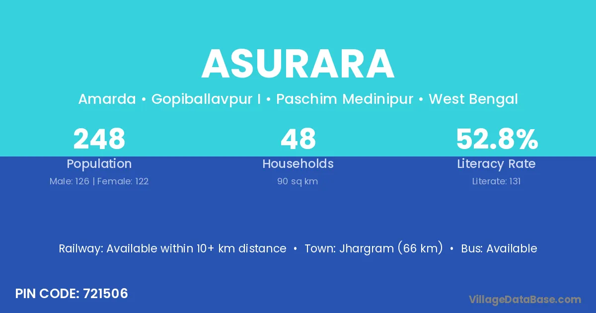The literacy rate of Asurara village is 38.16%. Male literacy stands at 41.77% and female literacy at 34.25%.