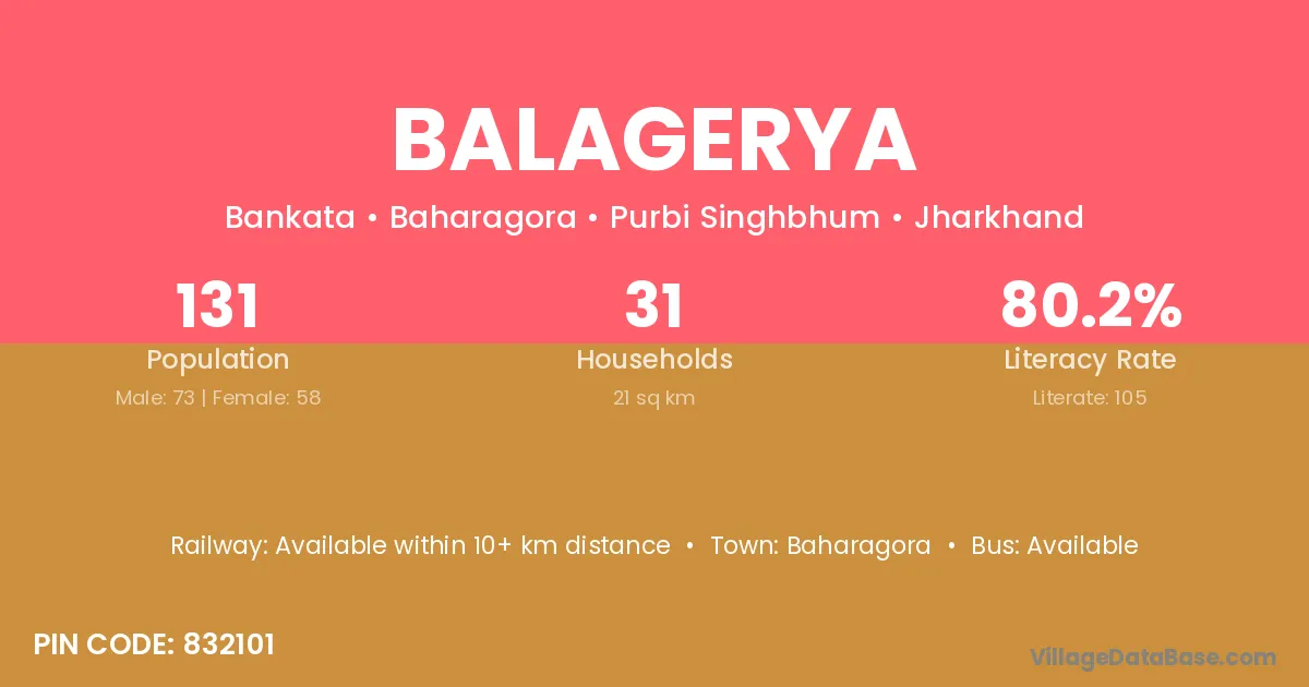 Balagerya village has a total population of 131 people, of which 73 are males and 58 are females.