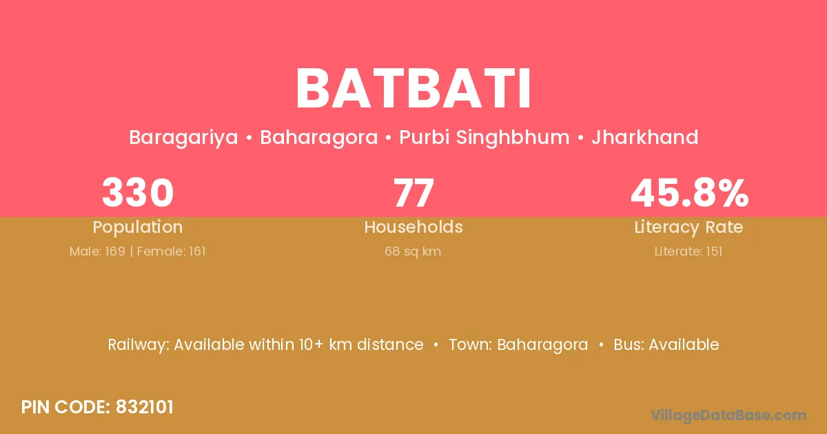 Batbati village has a total population of 330 people, of which 169 are males and 161 are females.
