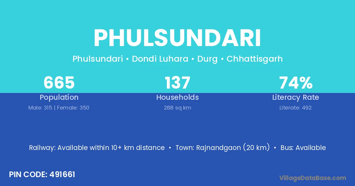 The literacy rate of Phulsundari village is 52.91%. Male literacy stands at 60.77% and female literacy at 43.15%.