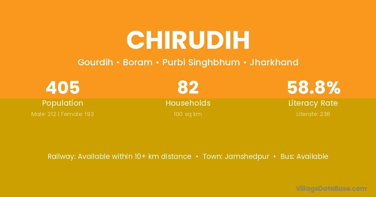Chirudih village has a total population of 405 people, of which 212 are males and 193 are females.