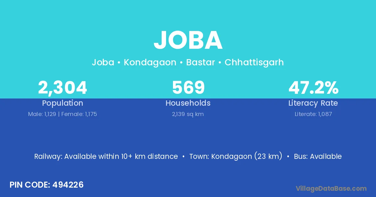 The literacy rate of Joba village is 40.14%. Male literacy stands at 50.00% and female literacy at 30.72%.
