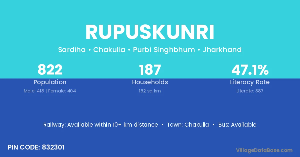 Rupuskunri village has a total population of 822 people, of which 418 are males and 404 are females.