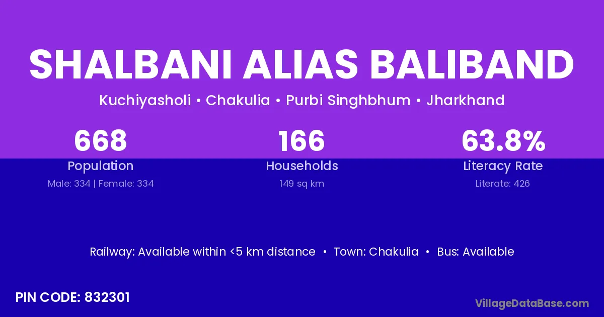 Shalbani Alias Baliband village has a total population of 668 people, of which 334 are males and 334 are females.