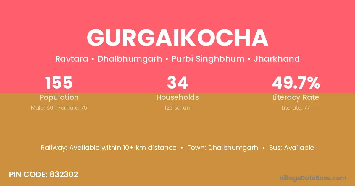 Gurgaikocha village has a total population of 155 people, of which 80 are males and 75 are females.