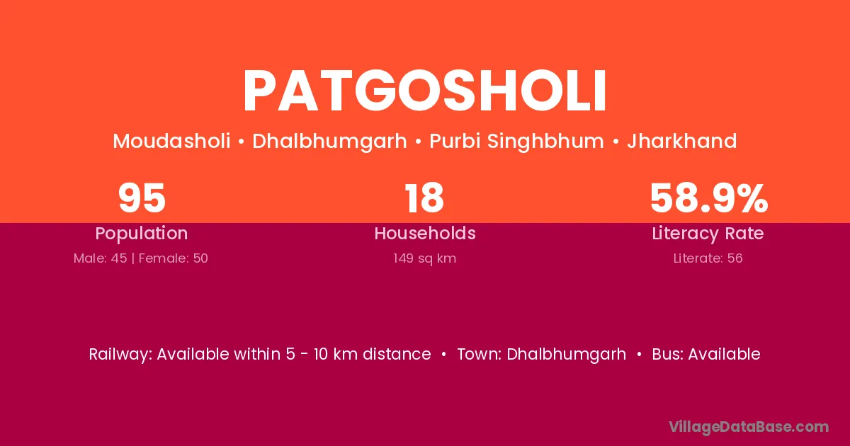 Patgosholi village has a total population of 95 people, of which 45 are males and 50 are females.