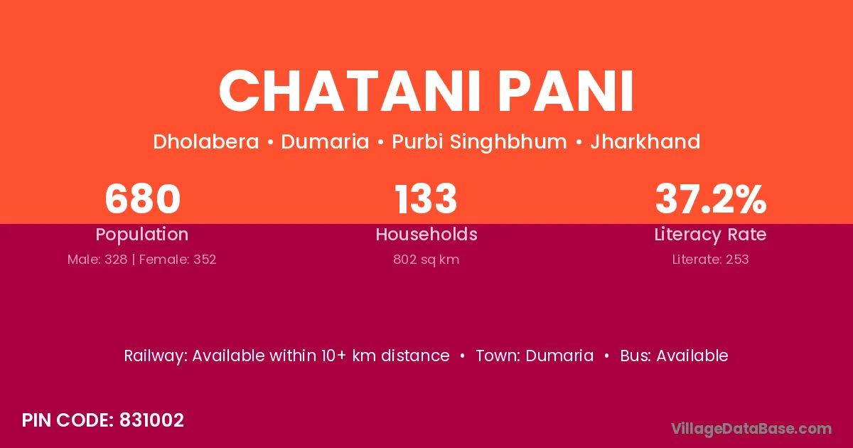 The literacy rate of Chatani Pani village is 37.21%. Male literacy stands at 45.73% and female literacy at 29.26%.