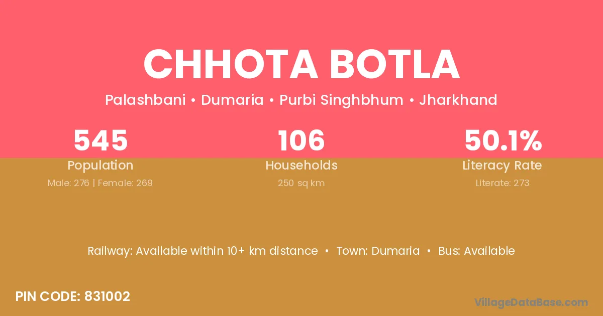 Chhota Botla village has a total population of 545 people, of which 276 are males and 269 are females.