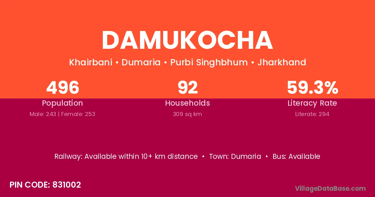Damukocha village has a total population of 496 people, of which 243 are males and 253 are females.