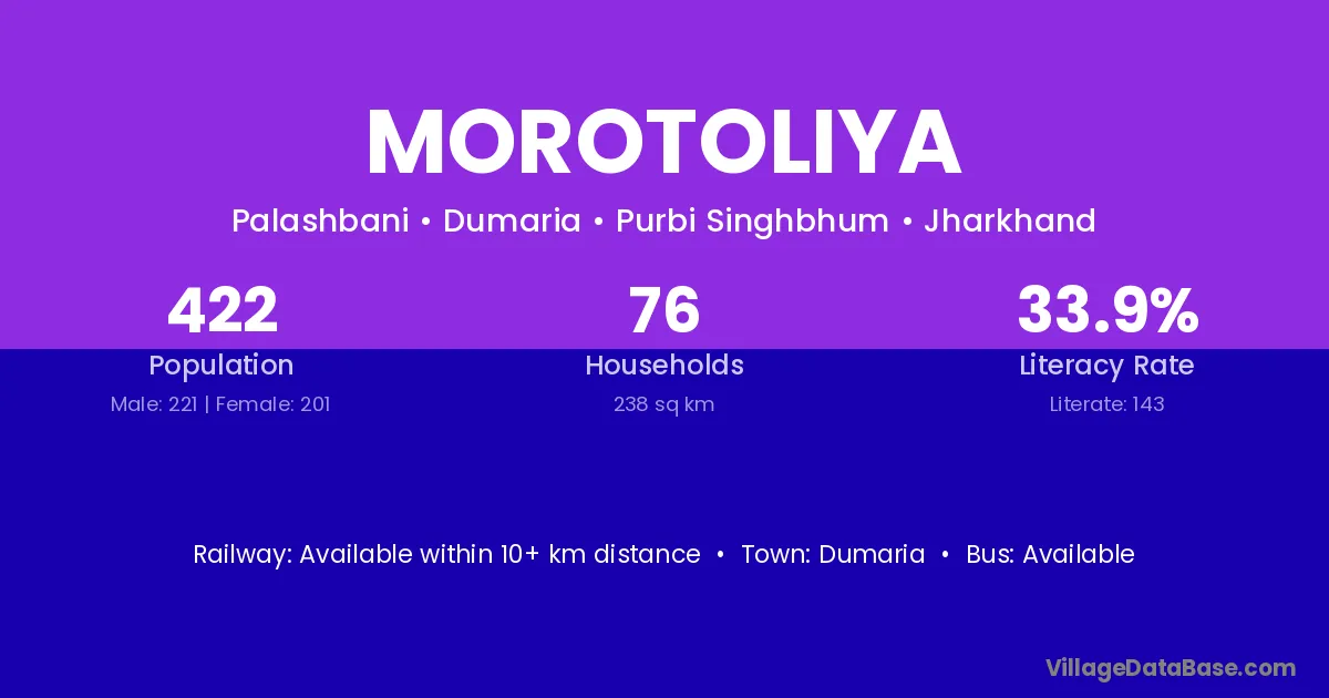 Morotoliya village has a total population of 422 people, of which 221 are males and 201 are females.