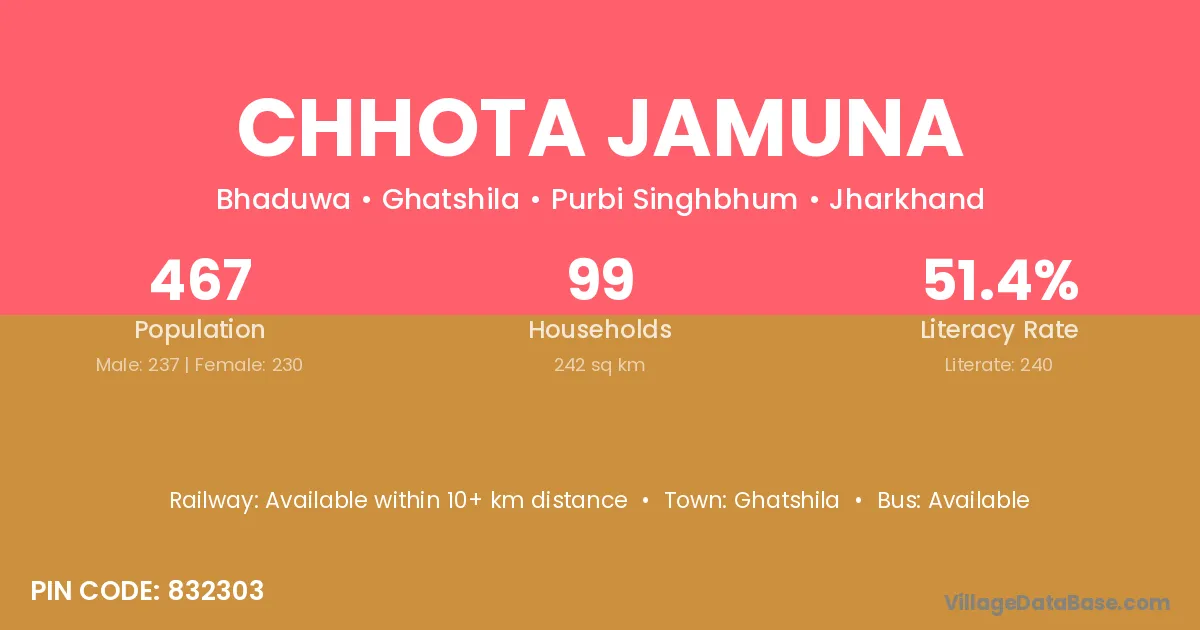 Chhota Jamuna village has a total population of 467 people, of which 237 are males and 230 are females.