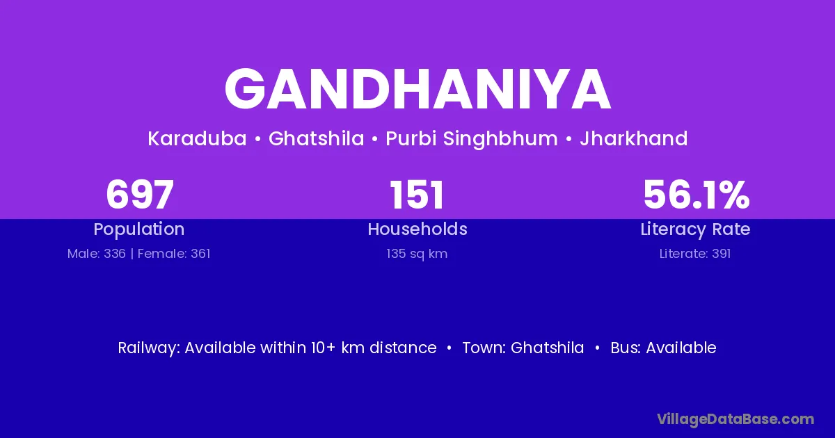 Gandhaniya village has a total population of 697 people, of which 336 are males and 361 are females.