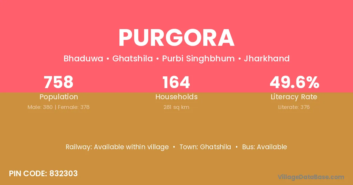 Purgora village has a total population of 758 people, of which 380 are males and 378 are females.