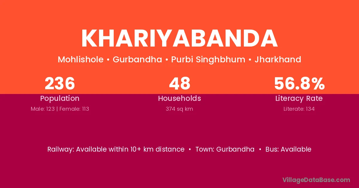 Khariyabanda village has a total population of 236 people, of which 123 are males and 113 are females.