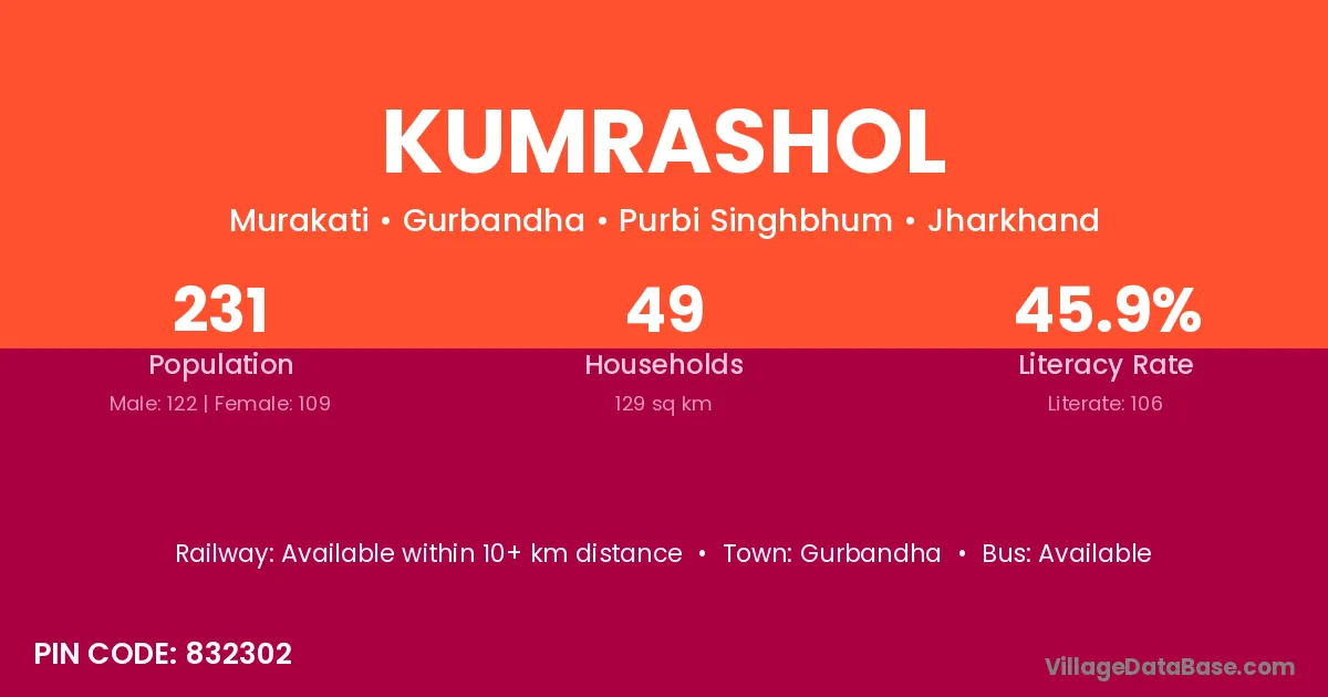 Kumrashol village has a total population of 231 people, of which 122 are males and 109 are females.