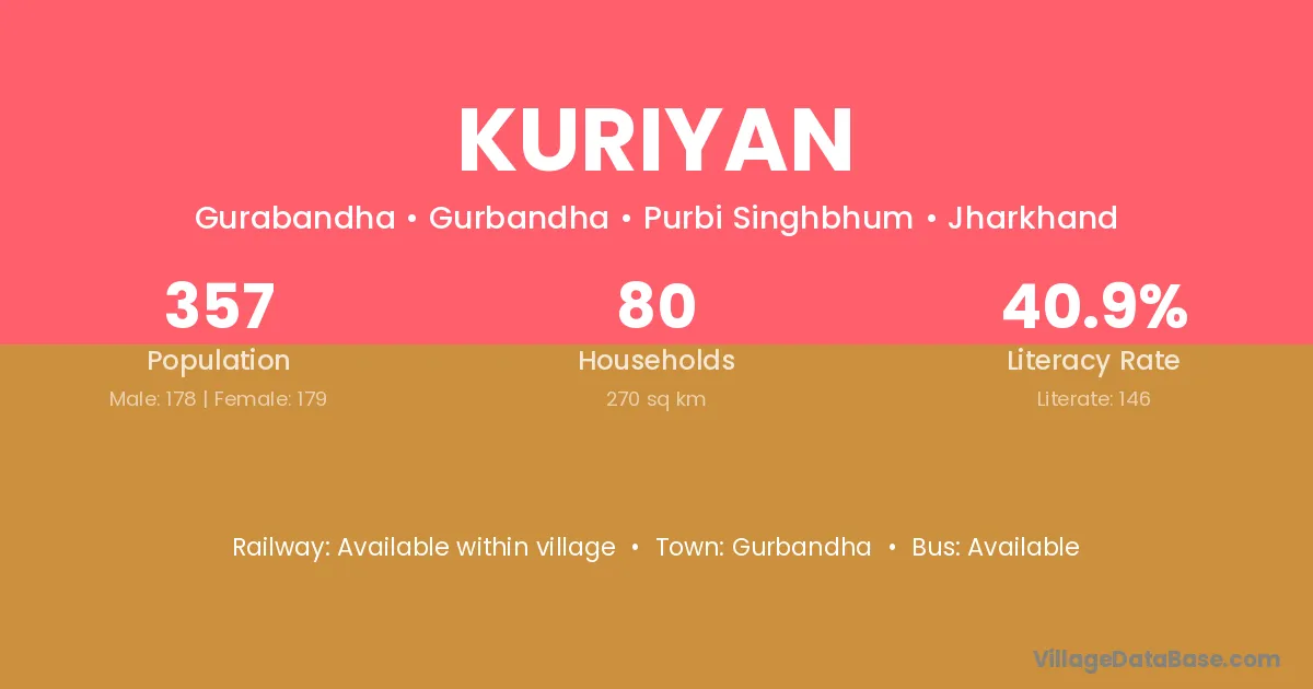 Kuriyan village has a total population of 357 people, of which 178 are males and 179 are females.