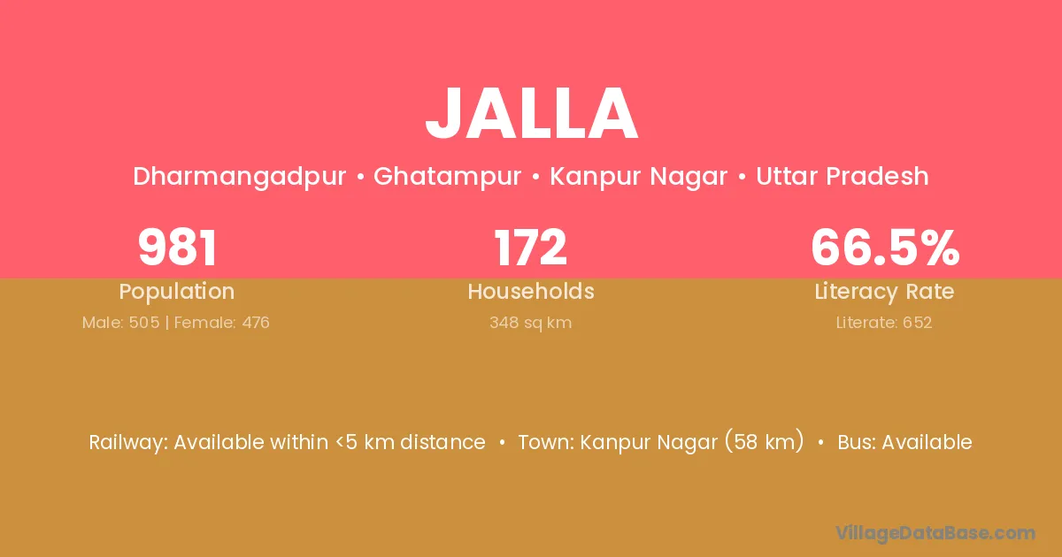 The literacy rate of Jalla village is 63.52%. Male literacy stands at 78.26% and female literacy at 48.41%.