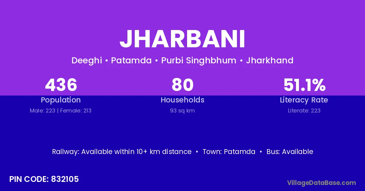 Jharbani village has a total population of 436 people, of which 223 are males and 213 are females.