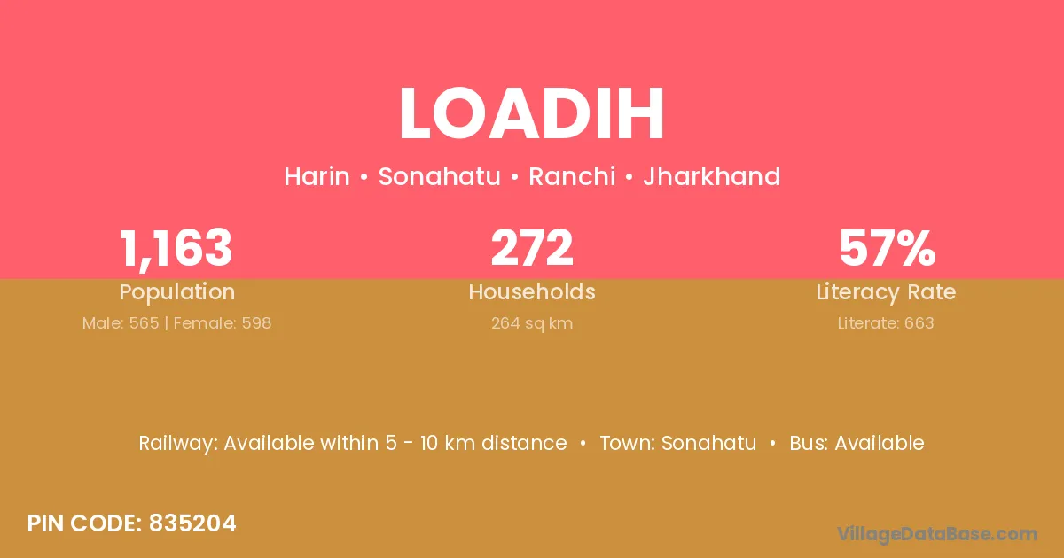 The literacy rate of Loadih village is 58.33%. Male literacy stands at 70.78% and female literacy at 44.92%.