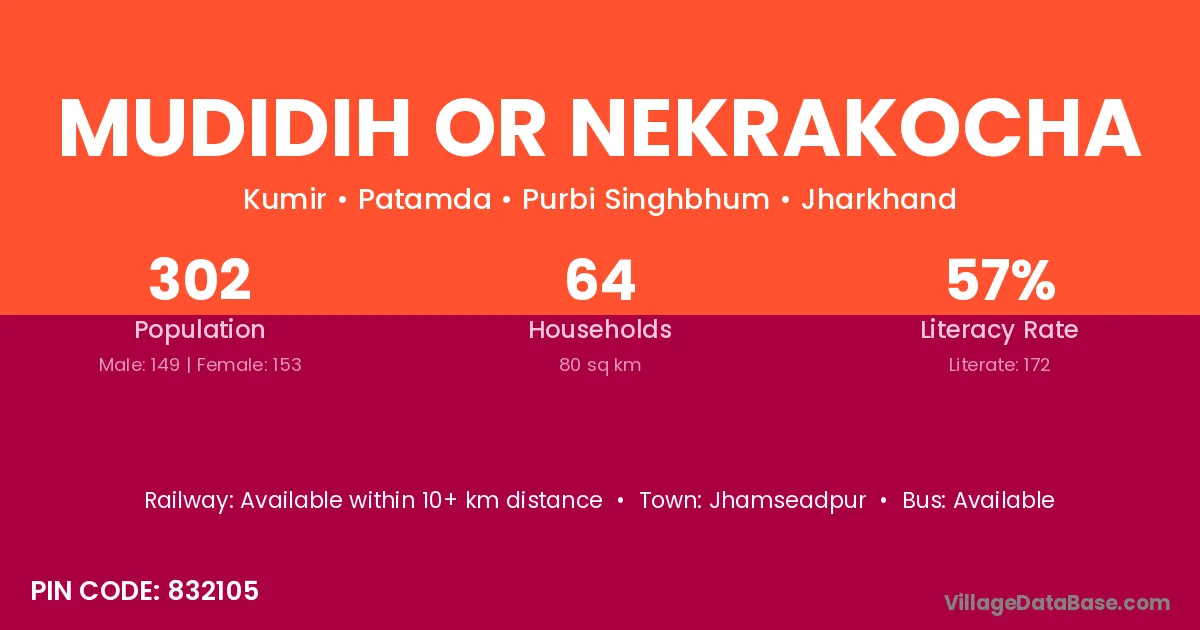 Mudidih Or Nekrakocha village has a total population of 302 people, of which 149 are males and 153 are females.