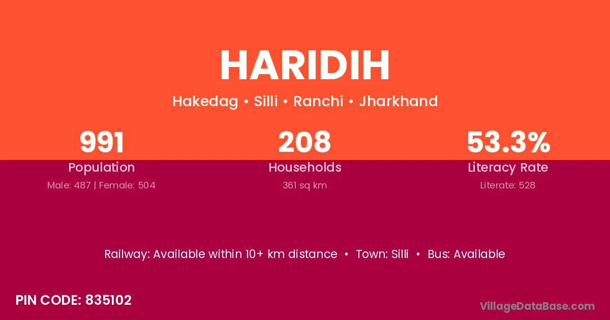 The literacy rate of Haridih village is 55.29%. Male literacy stands at 73.17% and female literacy at 38.64%.