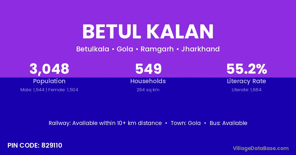 Betul Kalan village has a total population of 3,048 people, of which 1,544 are males and 1,504 are females.