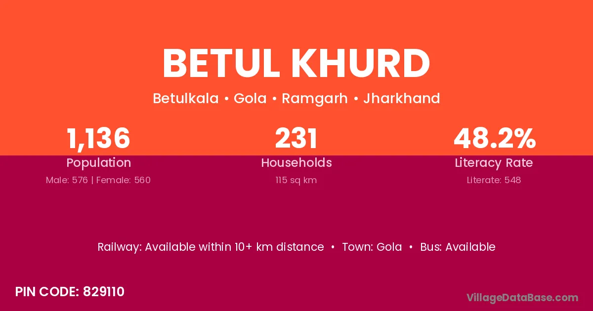 Betul Khurd village has a total population of 1,136 people, of which 576 are males and 560 are females.
