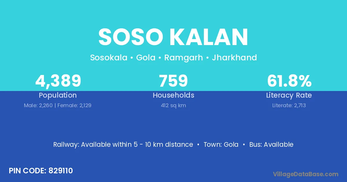 According to Census 2011 information, the village code of Soso Kalan village is 829110.