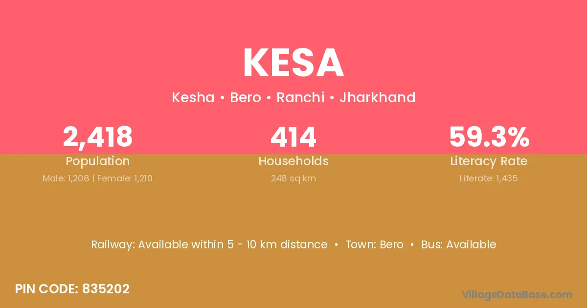 Kesa village has a total population of 2,418 people, of which 1,208 are males and 1,210 are females.