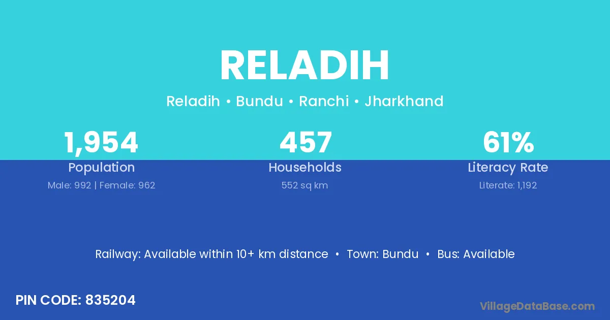 According to Census 2011 information, the village code of Reladih village is 835204.