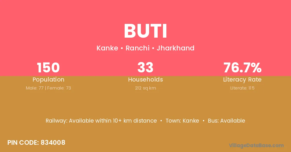 Buti village has a total population of 150 people, of which 77 are males and 73 are females.