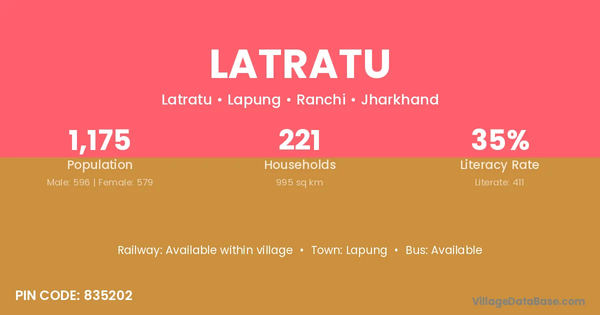 The literacy rate of Latratu village is 34.98%. Male literacy stands at 44.13% and female literacy at 25.56%.
