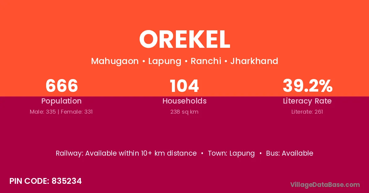 Orekel village has a total population of 666 people, of which 335 are males and 331 are females.