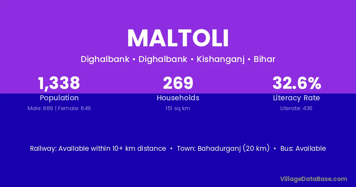 The literacy rate of Maltoli village is 55.68%. Male literacy stands at 63.55% and female literacy at 47.47%.