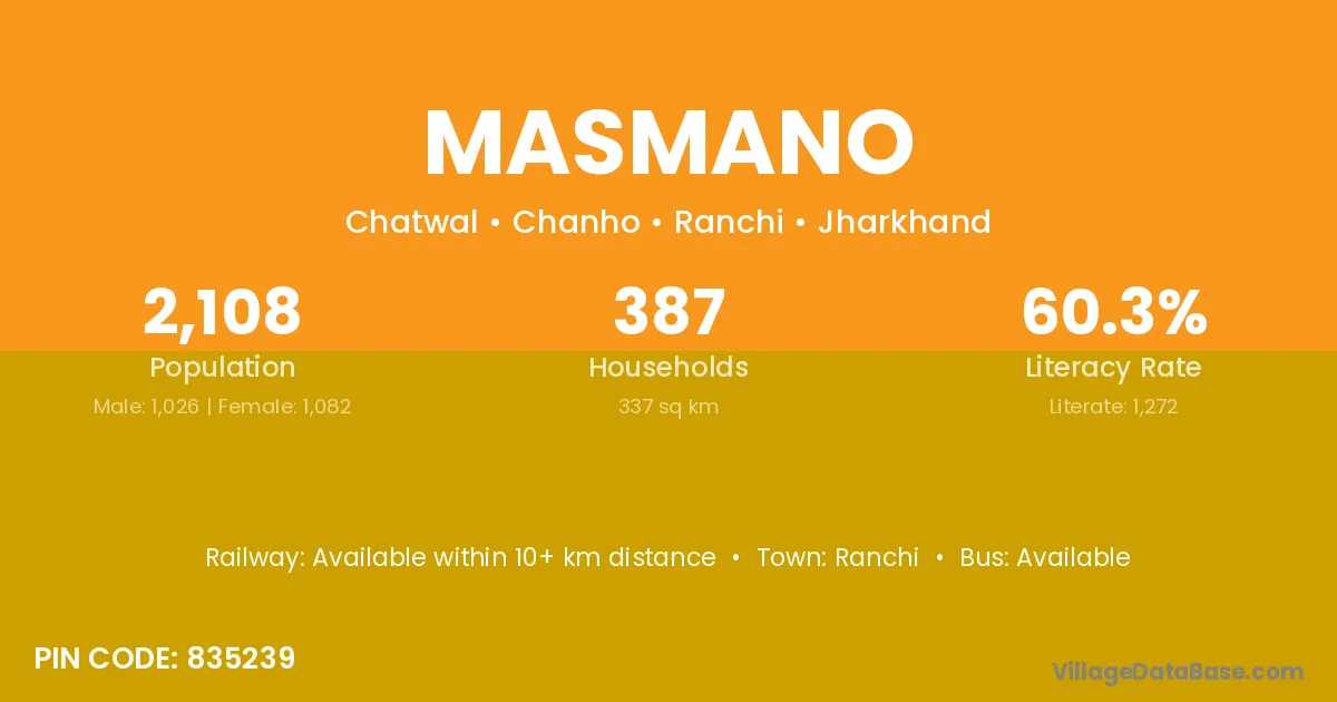 The literacy rate of Masmano village is 59.58%. Male literacy stands at 66.01% and female literacy at 52.71%.