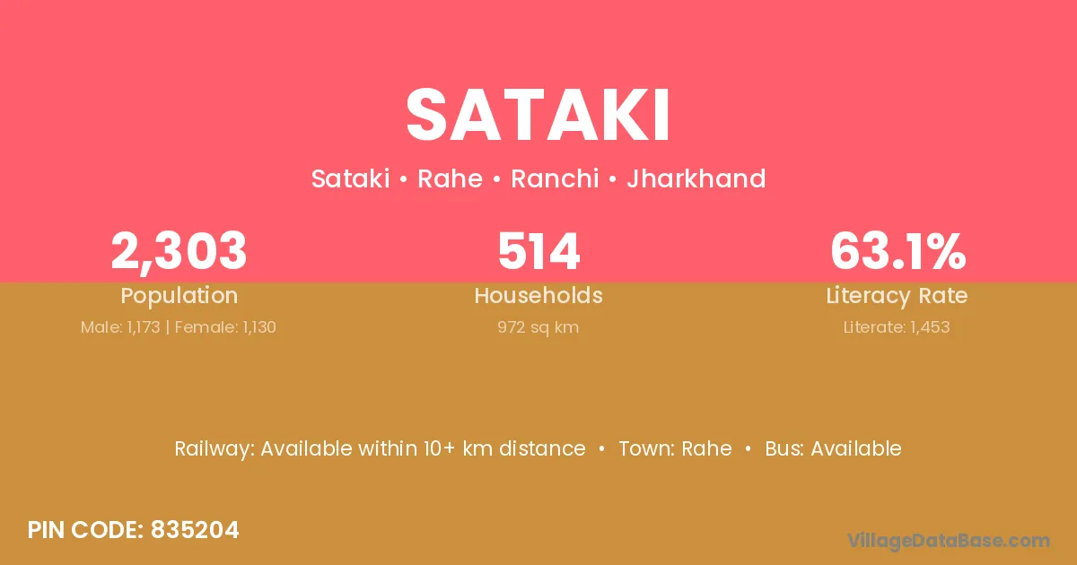 Sataki village has a total population of 2,303 people, of which 1,173 are males and 1,130 are females.