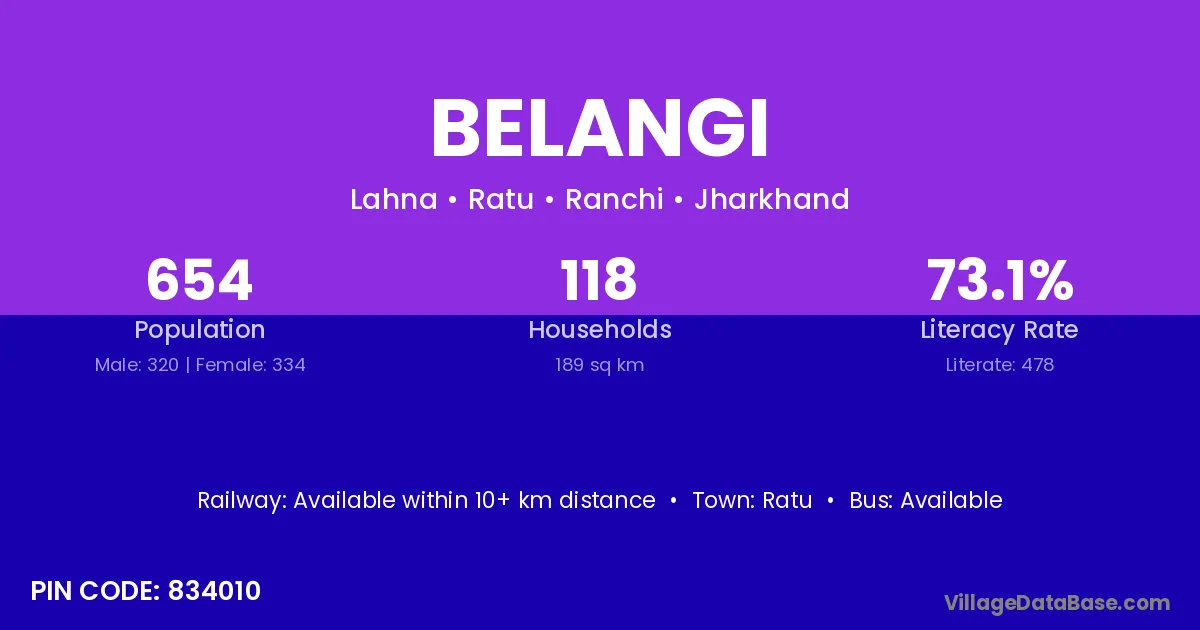 Belangi village has a total population of 654 people, of which 320 are males and 334 are females.