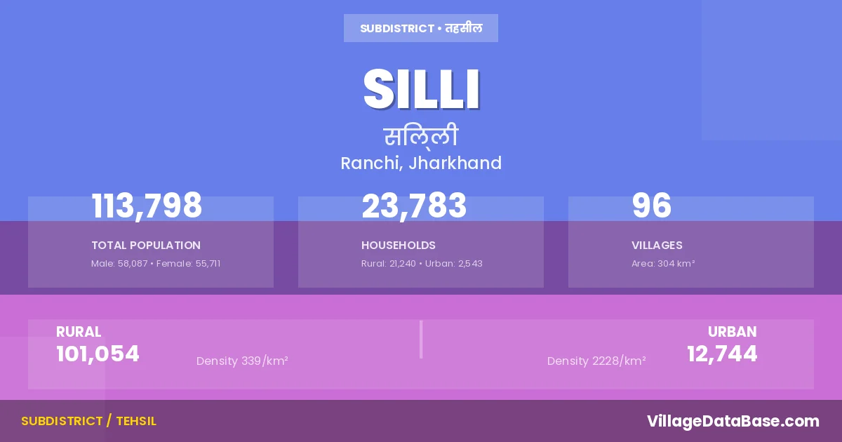 According to the 2011 census The total area of Silli Subdivision is 304 km², with a population of 113798 people. The population density is 375 inhabitants per square kilometre, and there are approximately 23783 houses in the sub district.