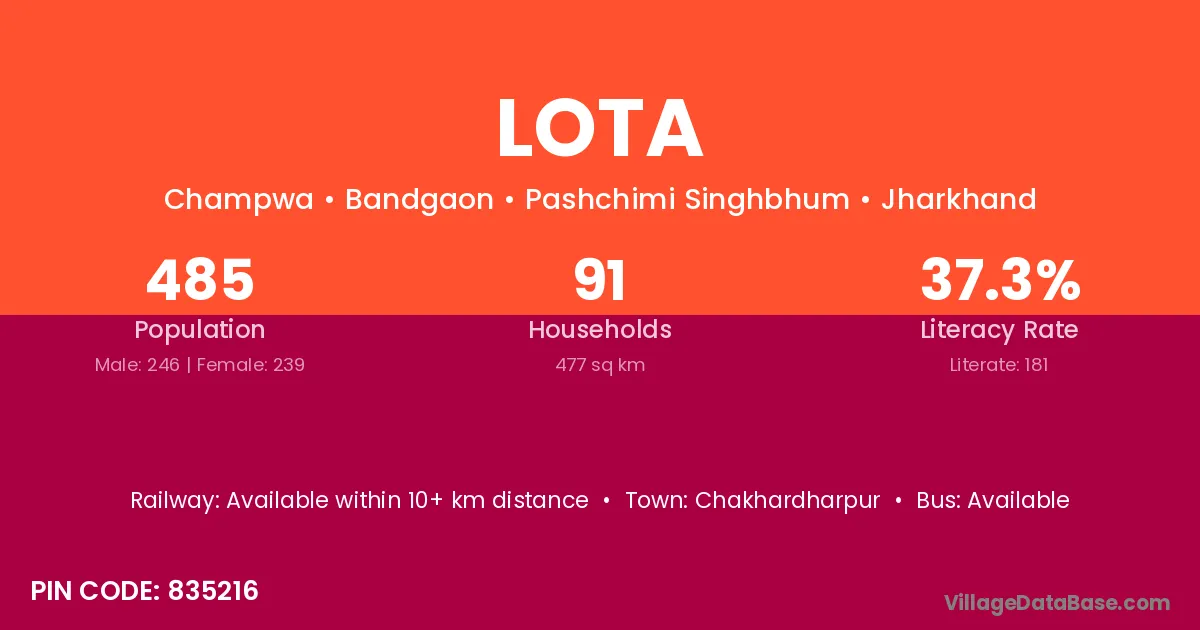 The literacy rate of Lota village is 61.28%. Male literacy stands at 73.19% and female literacy at 49.00%.