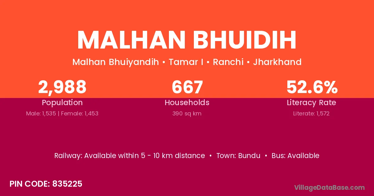 Malhan Bhuidih village has a total population of 2,988 people, of which 1,535 are males and 1,453 are females.