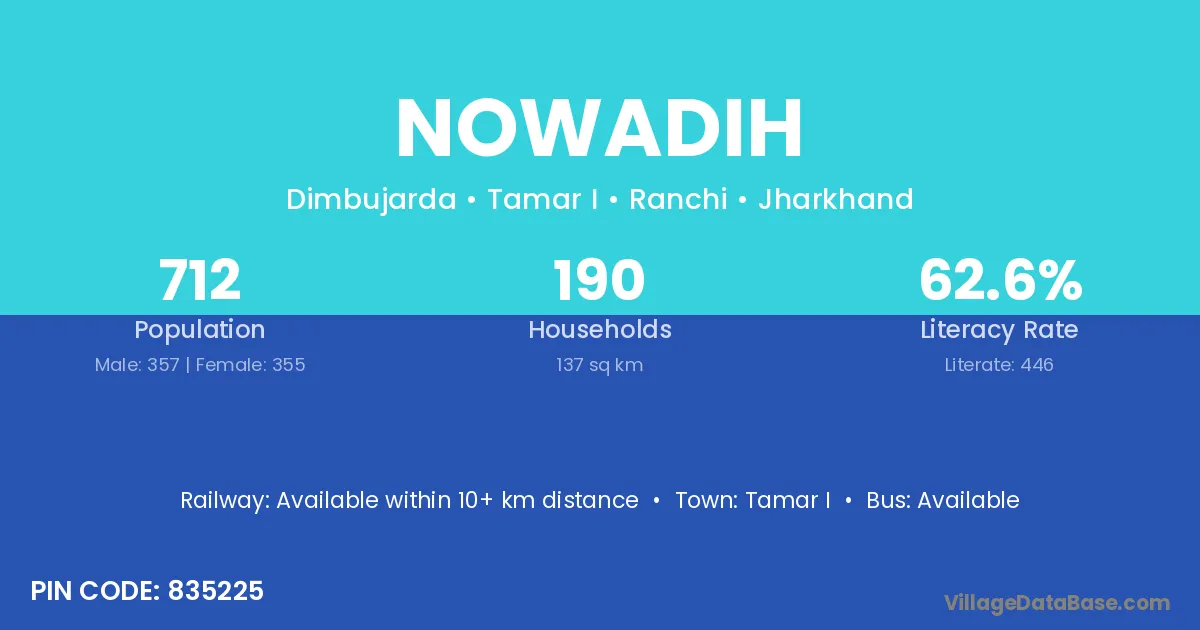 Nowadih village has a total population of 712 people, of which 357 are males and 355 are females.