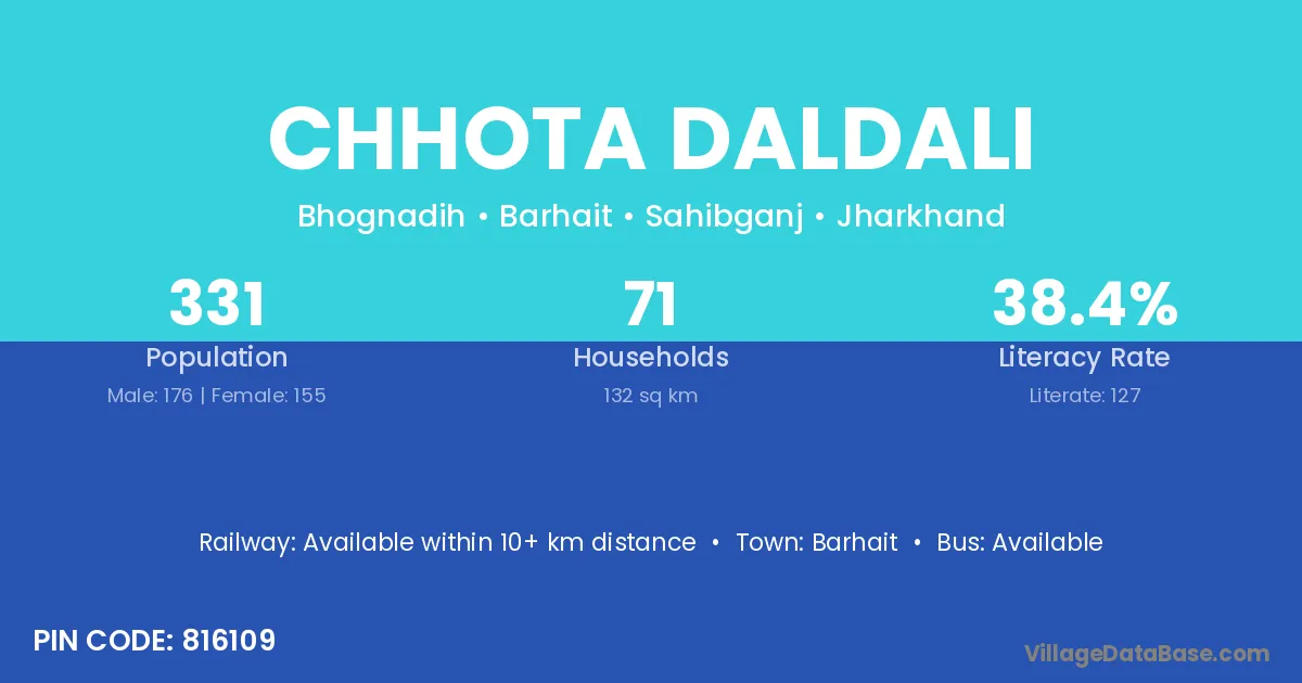 Chhota Daldali village has a total population of 331 people, of which 176 are males and 155 are females.