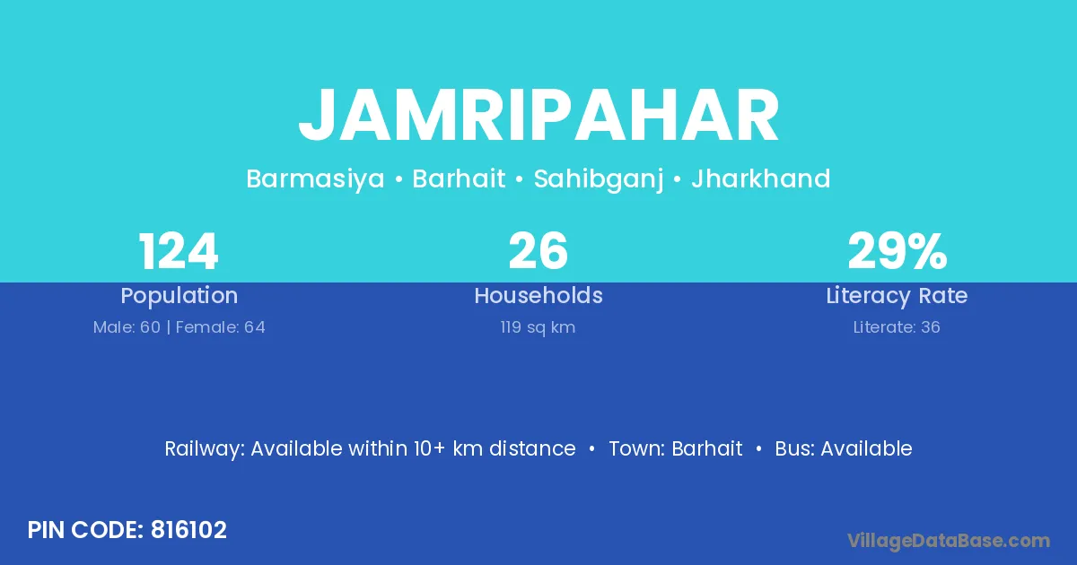 Jamripahar village has a total population of 124 people, of which 60 are males and 64 are females.