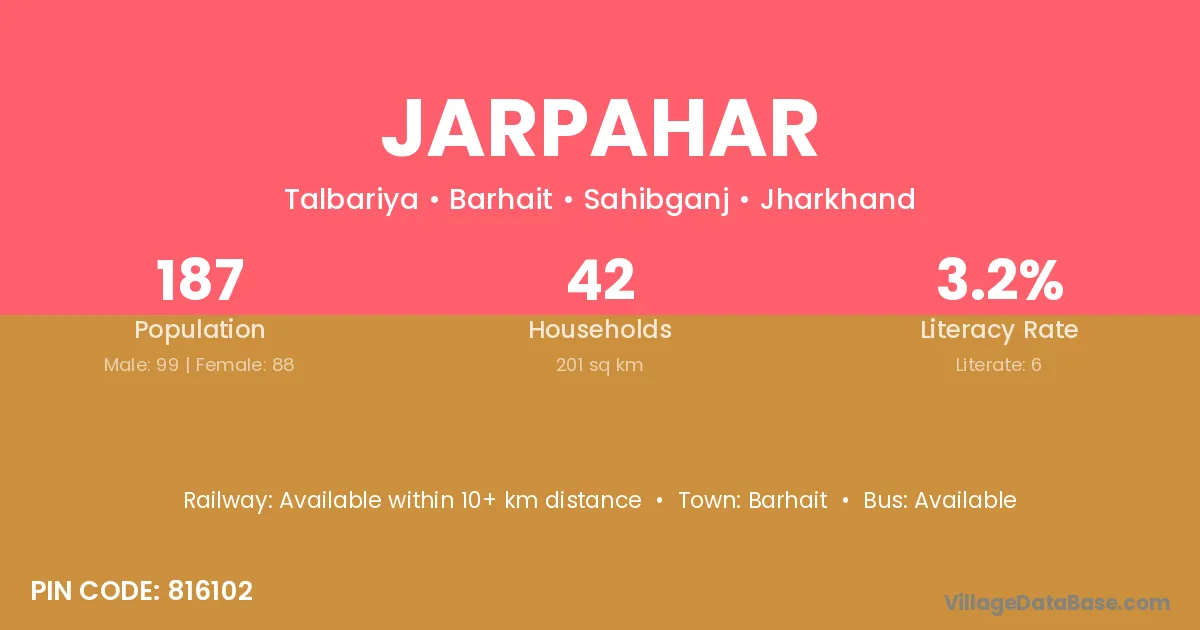 Jarpahar village has a total population of 187 people, of which 99 are males and 88 are females.