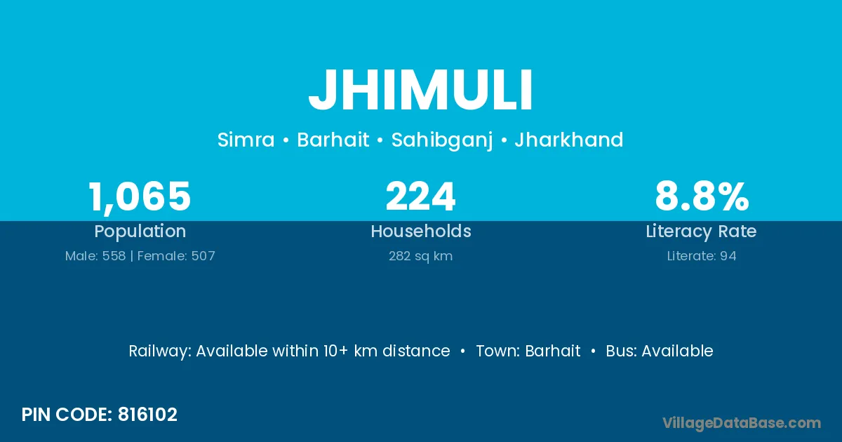 Jhimuli village has a total population of 1,065 people, of which 558 are males and 507 are females.