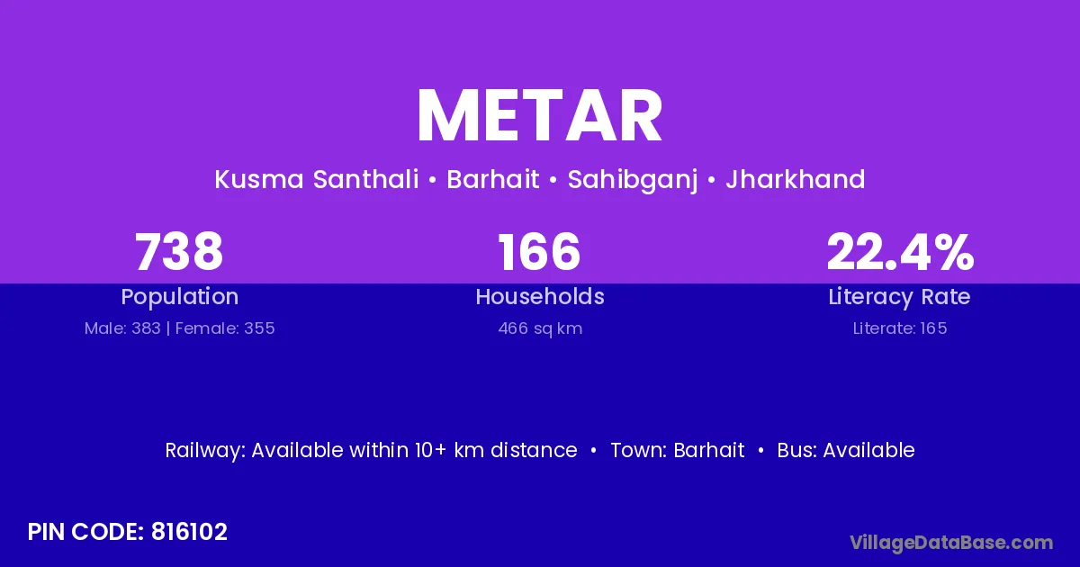 Metar village has a total population of 738 people, of which 383 are males and 355 are females.